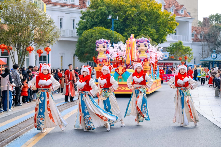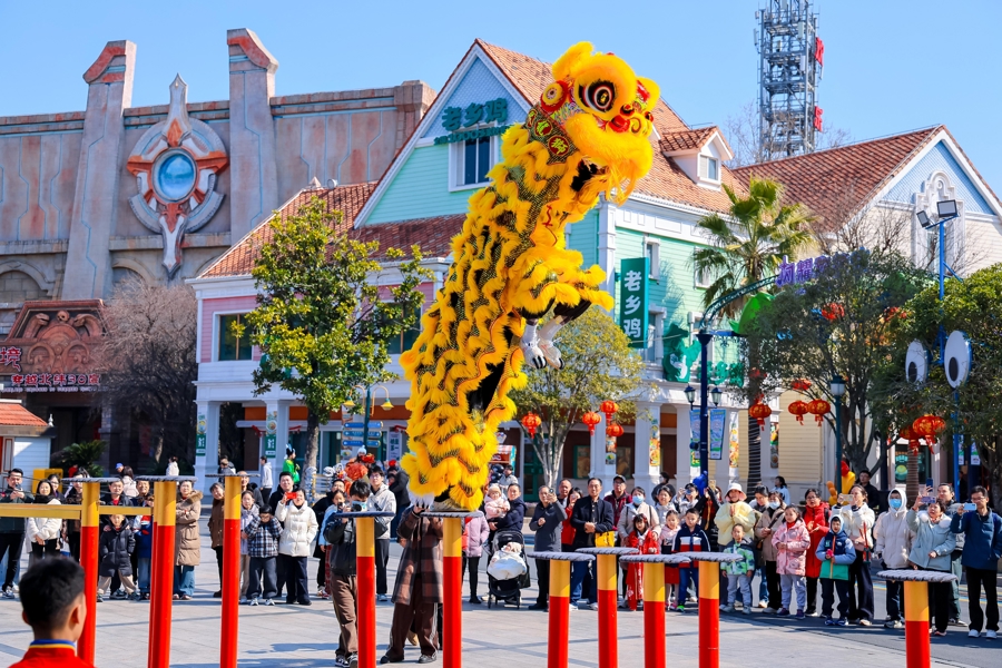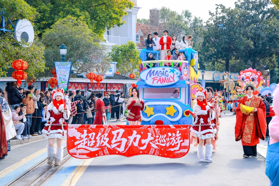 同时,园区特别推出马年定制非遗大戏《神驹献瑞》,融合高跷傩舞、高跷龙璃、马头舞等表演,展现传统艺术魅力。此外,火舞、梅花桩舞狮、顶缸等杂技演出以及《欢乐迎宾》《超级马力》花车巡游等近百场主题演艺全天轮番上演,营造浓厚春节氛围。